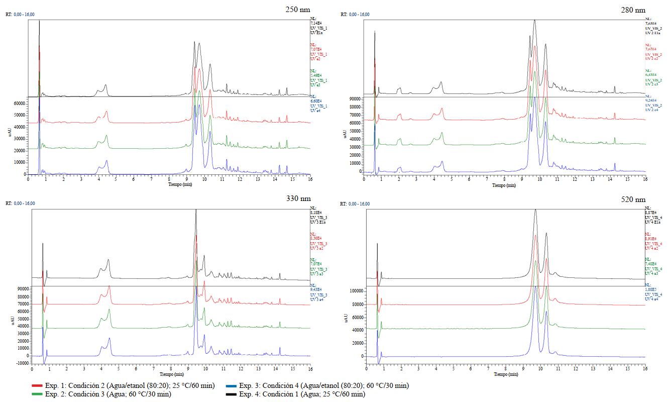 Los cromatogramas obtenidos, con las cuatro longitudes de ondas evaluadas, para el experimento M1, (extracto con G40/ MD60 secado por rotoevaporador) y los experimentos de secado por atomización con similar encapsulante (M2 y M3) fueron muy similares. Lo anterior sugiere que no ocurrieron cambios en la composición química cualitativa, aún después de someter las muestras a elevadas temperaturas. Un comportamiento similar mostró la mezcla de encapsulante (G60/MD40), correspondiente a los experimentos M4, M5 y M6.