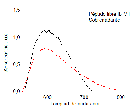 La inmovilización del péptido Ib-M1 en IONP@ se monitoreó por medio de la determinación de la absorbancia a 595 nm antes y después de realizar el lavado. Los resultados se muestran en la figura 1, en donde se observa una disminución en la absorbancia del sobrenadante proveniente de la centrifugación del IONP@Ib-M1, lo que indica que disminuyó la cantidad de péptido en solución y fue, por tanto, inmovilizado después de dos horas de agitación. El porcentaje de inmovilización del péptido Ib-M1 en las IONP@ fue de 45,23%.