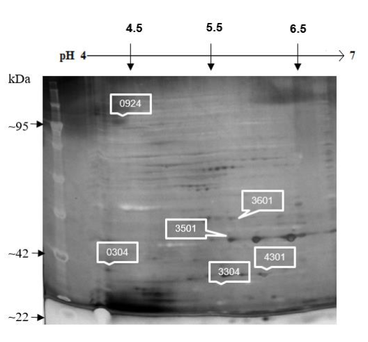 Como resultado de la exposición de E. coli O157:H7 bajo el tratamiento con IONP@Ib-M1, fueron detectadas un total 17 puntos de proteínas expresados; 25 se inhibieron con respecto al control, dos se expresaron con respecto al control, 11 tuvieron una sobreexpresión ≥ 1,5 y dos una inhibición ≤ 1,5. De aquellas proteínas que estuvieron presentes tanto en el perfil de proteínas control como en el perfil de proteínas del tratamiento con IONP@Ib-M1, seis presentaron diferencias estadísticamente significativas (p≤0,05) las cuales se muestran en la figura 6.