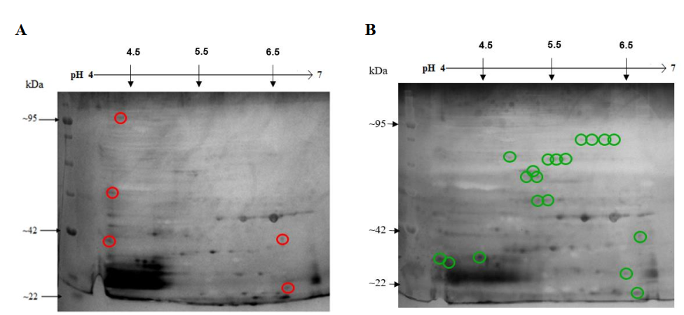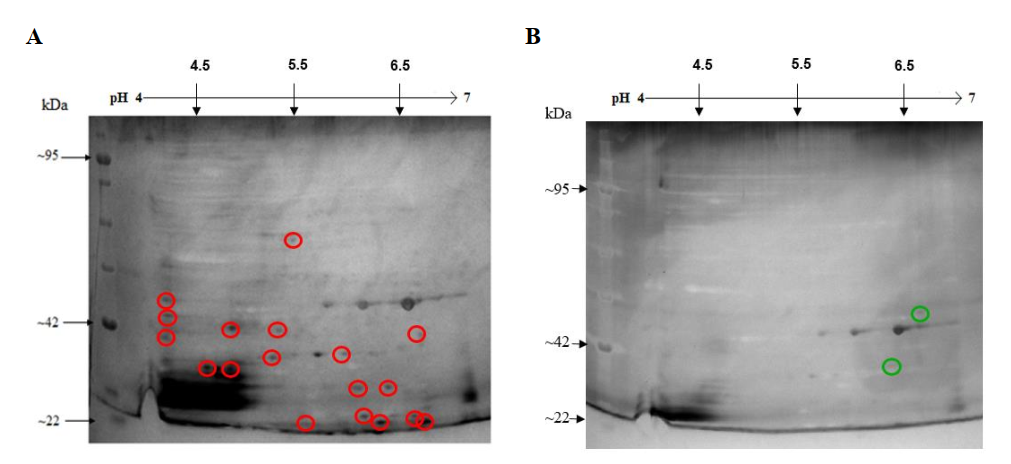 Figura 9. (A) Mapa bidimensional del proteoma control de E. coli O157:H7 ATCC 43888 después de 9 h de incubación. (B) Mapa bidimensional del proteoma control de E. coli O157:H7 ATCC 43888 después de 9 h de incubación con IONP@. Los círculos rojos evidencian manchas inhibidas bajo tratamiento y los círculos verdes son manchas expresadas bajo tratamiento.