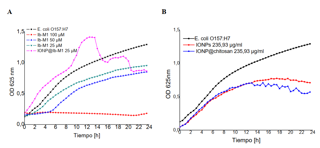 Los efectos inhibitorios de Ib-M1 se han estudiado en varias ocasiones [7, 8] bajo diferentes condiciones de cultivo. Se ha encontrado que el grado de inhibición depende de diferentes parámetros como la concentración celular. Teniendo en cuenta lo anterior, y con el objetivo de determinar cómo se podría afectar la cinética de crecimiento y a partir de qué momento de incubación se podría realizar el análisis con base en su cambio drástico en crecimiento, se analizó la respuesta de crecimiento celular bajo tratamientos con Ib-M1, IONP@Ib-M1, IONPs y IONP@ usando el método de microdilución. En la figura 2 se muestran los resultados obtenidos de cinética de crecimiento de E. coli O157:H7 bajo los diferentes tratamientos.