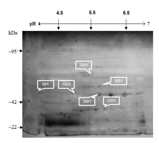 Después de identificar los patrones de expresión se realizó la aproximación a la identificación de las proteínas expresadas que presentaron diferencias estadísticamente significativas, aquellas que para nuestro conocimiento no han sido reportadas se indicaron con NR. La posible identificación de las proteínas se lista en la tabla 1.