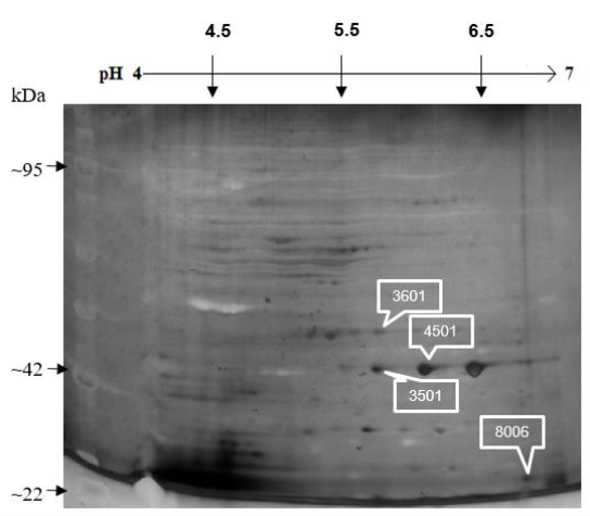 Después de identificar los patrones de expresión se realizó la aproximación a la identificación de las proteínas expresadas y aquellas que presentaron diferencias estadísticamente significativas. La posible identificación de las proteínas se lista en la tabla 4.