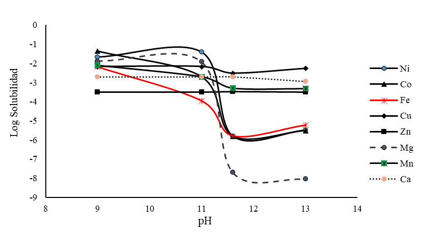 Los iones Cu2+, Zn2+, Ca2+ y Mn2+ no presentaron cambios importantes en la solubilidad para diferentes pH y, en general, fueron los más solubles. Los resultados antes descritos sugieren que podría lograrse la coprecipitación mayoritaria de los iones Ni2+, Co2+, Fe2+ y Mg2+ y en menor cuantía de los restantes, a partir del intervalo de pH comprendido entre 11,3 y 11,6 que corresponde a concentraciones de iones OH. iguales a 2,2 y 2,3 mol·L-1, respectivamente. Las concentraciones de iones OH. y pH por debajo de estos valores no garantizan suficiente disminución de solubilidad para lograr altos niveles de precipitación de los cationes analizados (Figura 4)