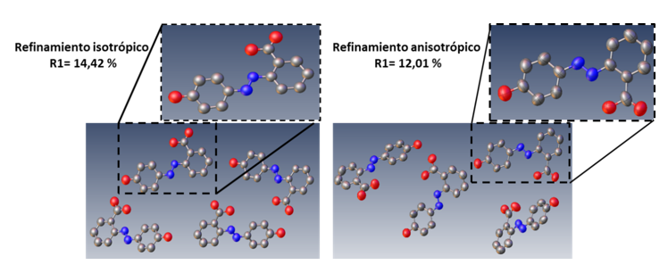 El refinamiento anisotrópico representa un modelo químico más razonable del sistema con respecto a la distribución de la densidad electrónica y potencialmente puede reducir las estadísticas de refinamiento de los índices de correlación R1 y wR2 (por ejemplo R1 en Figura 3), siempre que se utilicen datos con resolución adecuada y un buen factor de discordancia interno (Rint) [30]. Para un modelo de estructura bien refinado, el valor de R se aproxima a un valor pequeño, que corresponde a los errores en los datos experimentales y en el modelo [31]. El patrón de difracción se genera por la interacción de los electrones en el cristal con los fotones de rayos X [32]; sin embargo, los átomos más ligeros como el átomo de hidrógeno son difíciles de localizar, esto debido a que su baja densidad electrónica (un electrón) tiene un efecto muy débil sobre el patrón de difracción, por tanto, para posicionarlos durante el refinamiento de la estructura, los átomos de hidrógeno se localizan de manera manual y estereoquímica y teniendo en cuenta las distancias y enlaces aceptados, para así mejorar el refinamiento y obtener una estructura con sentido químico.