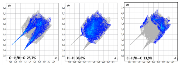 , indicando que la superficie es formada cuando la contribución de la promolécula a la densidad de electrones del procristal excede la de todas las demás moléculas del cristal w (r) ≥ 0,5. Lo cual garantiza un máximo de proximidad entre moléculas vecinas [12]. A partir de esta superficie se pueden determinar diferentes funciones de distancia desde la superficie de Hirshfeld de una molécula hasta el interior (di) o el exterior (de) de la superficie del átomo más cercano. Al graficar estos valores para una molécula dentro de un cristal, es posible obtener la huella digital (fingerprints plot) de las interacciones intermoleculares [13].