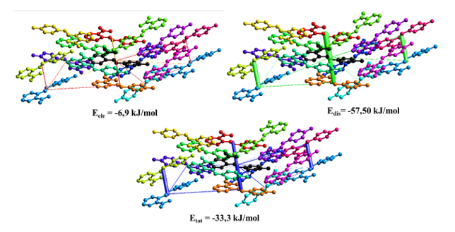 La energía total más alta de interacción (Etot) es -33,3 kJ/mol entre la molécula de la unidad asimétrica y la molécula naranja al costado (Figura 11), donde la mayor contribución se da en términos de energía de dispersión (Edis = -41,6 kJ/mol), seguida de una menor energía electrostática (Eele = -6,9 kJ/mol). La primera interacción energética se debe a contactos débiles de Van der Waals y la segunda a posibles contacto dipolo-dipolo. La segunda interacción más fuerte tiene una energía Etot = -28,1 kJ/mol, la cual tiene la componente de energía de dispersión más alta de todas las energías calculadas Edis= -57,5 kJ/mol; consecuencia esta de los contactos tipo H···H, tal como se observó anteriormente en las huellas dactilares donde las contribuciones predominantes provenían de este tipo de contactos. Cabe anotar que, en ambos casos, los valores de energía de repulsión están entre 18,2 a 22,5 kJ/mol, los cuales afectan la estabilidad del empaquetamiento cristalino.