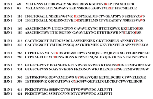 Figura 2: Alineamiento secuencial entre H1N1 y H5N1. Los aminoácidos conservados se muestran en color rojo.