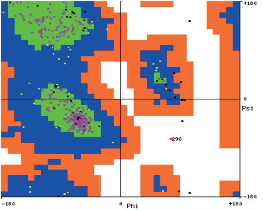 La predicción de la estructura secundaria de H1N1 mostró una composición del 6,83% en hélices alfa; 36,56% en hojas betas y 56, 61% en estructuras irregulares, evento que hace inferir una estructura poco definida. Estos resultados concuerdan con la composición porcentual de aminoácidos, en que los residuos involucrados en la formación de hélices alfa están en baja proporción (Met, His, Ala y Gln) mientras que los participantes en giros como la glicina están en alta proporción. Por su parte, el diagrama de Ramachandran (Figura 3) corrobora esta información al indicar la presencia de aminoácidos en regiones permitidas para hélices alfa y hojas betas.