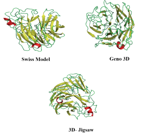 En aras de obtener la estructura 3D de H1N1 se utilizó como plantilla la cadena A de la H5N1 (PDB: 2HTY) y los servidores de modelado por homología Swiss Model, Geno 3D y 3D-Jigsaw, los modelos obtenidos se muestran en la Figura 4.