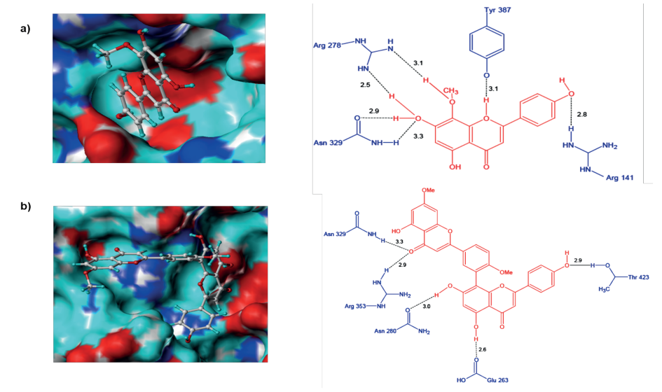 En el caso de Ginkgetin adoptó una conformación poco favorable dentro del sitio activo de H1N1, debido a que solo una parte de este ingresó a la cavidad (Figura 6b). Este hecho podría entonces explicar su baja capacidad inhibitoria (Tabla 1). Al analizar las interacciones se observó que Ginkgetin formó cinco puentes de hidrógeno, siendo el más relevante el establecido entre Arg353 (sitio activo) y el grupo carbonilo de C4, así mismo, este grupo también interactuó con Asn329. Los demás puentes se formaron con Asn280, Glu263 y Thr423 y los grupos OH del ligando. Por otro lado, a diferencia del complejo H1N1-F36, este presenta solo una interacción de tipo hidrofóbico (Arg353), lo cual corrobora su baja estabilidad dentro del sitio activo.