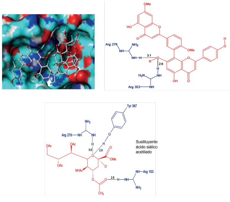 Al revisar la conformación del ligando 3R dentro de la proteína H1N1, se observó que su contacto principal fue a través del sustituyente de ácido siálico acetilado, quedando por fuera la parte biflavonoide; situación que es de esperarse debido al gran volumen de 3R (Figura 7). Las pocas interacciones de este complejo se establecieron mediante cuatro puentes de hidrógeno formados entre Arg278, Arg353 y el oxígeno de C7”, Arg278, Tyr378 y el sustituyente ácido siálico acetilado, mientras que las interacciones hidrofóbicas se presentaron con los residuos Pro416, Thr423 y Glu262 como se muestra en la Figura 7.
