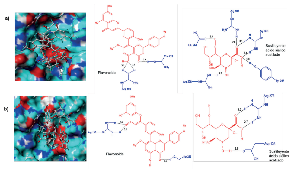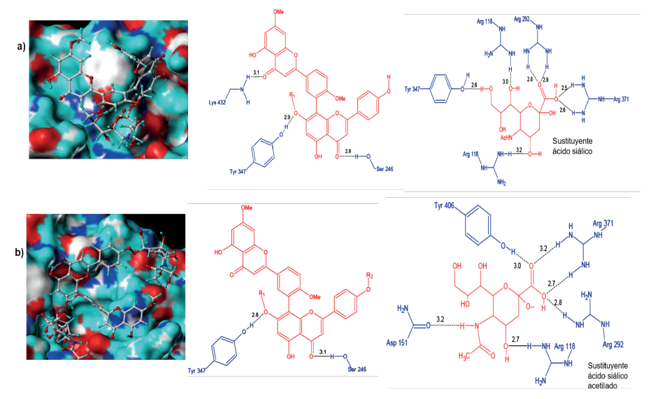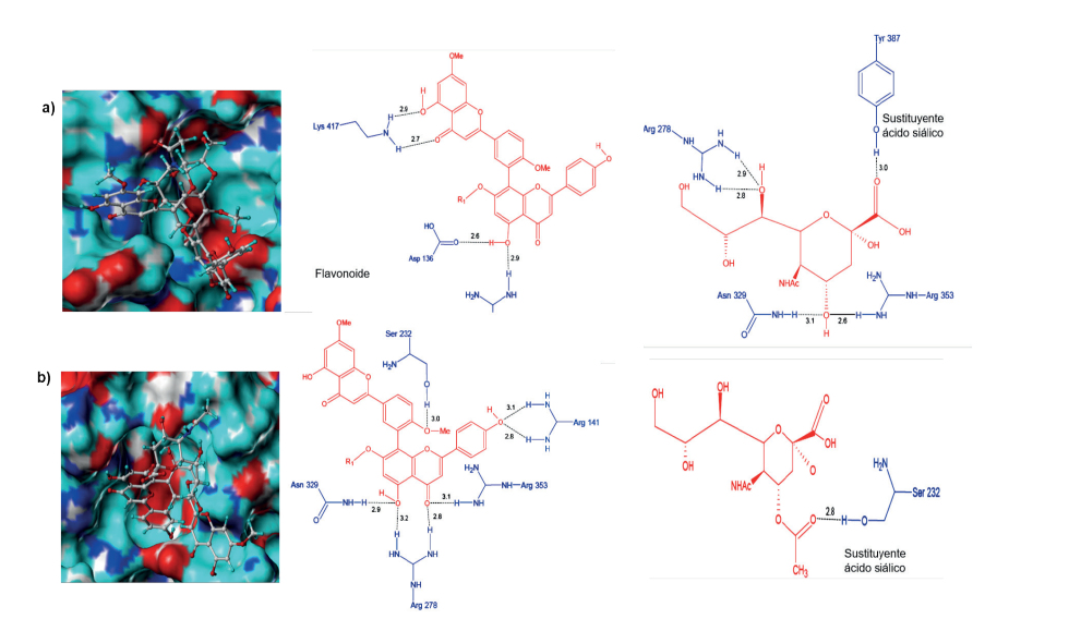 Por su parte, el complejo 5S-H1N1 mostró que el ligando adoptó una conformación similar a la de 5R dentro de sitio activo de la proteína (Figura 8b). La parte biflavonoide formó cinco puentes de hidrógeno, siendo dos de ellos con residuos del sitio activo (Arg278 y Arg353), mientras que el sustituyente ácido siálico acetilado solo tuvo un contacto (Figura 8b). Los contactos hidrofóbicos se establecieron con los residuos Pro231, Lys135, Ile208, y Asp136, resaltando que los dos últimos pertenecen al sitio activo de la proteína. Por tanto, esta información deja en evidencia que la actividad inhibitoria de los ligandos 5R y 5S está relacionada con su capacidad de acople al sitio activo y el tamaño de sus sustituyentes.