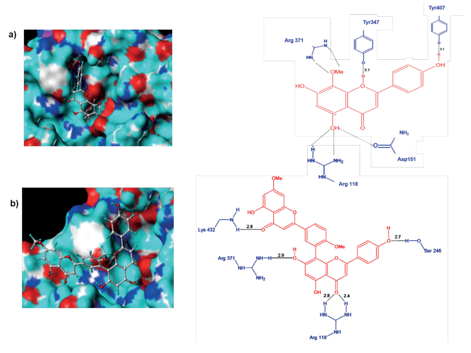 Figura 10: Conformación de los ligandos e interacciones entre el sitio activo de la neuraminidasa H5N1 y a) F36 y b) Ginkgetin.