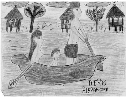 En el siguiente hilo conductor interpretativo, se ilustra esta trayectoria, a través de las narraciones orales y pictóricas de los niños y niñas participantes en la investigación. En una de dichas narraciones ideográficas (figura 1), se representa "Un día en su vida", en la que la niña relata una de sus faenas diarias en el territorio del Bajo San Juan. En dicha narración puede constatarse que en el proceso de socialización primaria, los niños y niñas wounaan internalizan sus prácticas culturales y toda forma de vida, principalmente ligadas a las labores agrícolas, pesca, caza, vivienda, vestido, comunicación, etc.