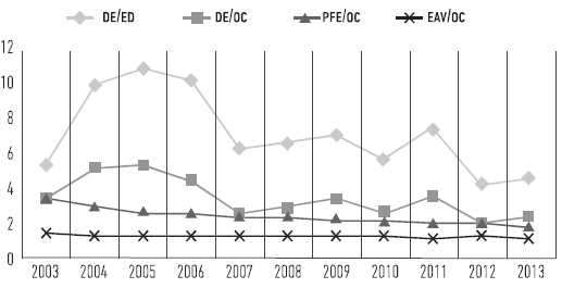 En la figura 2 se muestran las tendencias de las distancias existentes entre distintos pares de estratos seleccionados, calculadas a partir de razones de ingresos. Al analizar la brecha entre el estrato superior y el inferior (razón DE/ED), s eobserva que esta aumentó considerablemente hasta 2006, para luego bajar, con algunas oscilaciones, y adquirir en el 2013 una distancia entre estratos inferior a la del 2003. Por su parte, es notoria la disminución de la brecha de ingresos totales entre el estrato de profesionales y el de obreros calificados: si en el 2013, un individuo perteneciente al primer estrato ganaba casi tres veces y medio más en promedio que un obrero calificado, en el 2013, esa distancia se redujo a menos del doble. Por otro lado, la distancia de ingresos entre los obreros calificados y los empleados administrativos y vendedores, se mantiene aún levemente en favor de los segundos, lo que resalta el carácter difuso que adquiere la frontera manual/ no manual, al menos en términos de ingresos.