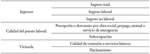 Por otro lado, se seleccionó una serie de variables que permitieran caracterizar algunos aspectos de la evolución de las condiciones de vida de los distintos estratos sociales. En la tabla 3 se presentan las dimensiones y variables relevadas:
