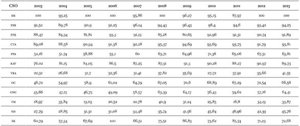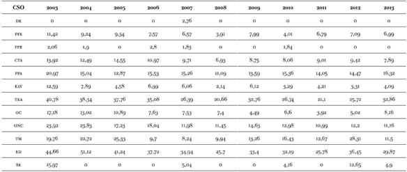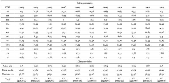 Tabla 4: Distribución de estractos y clases sociales (en porcentaje) según año (GBA 2003-2013)