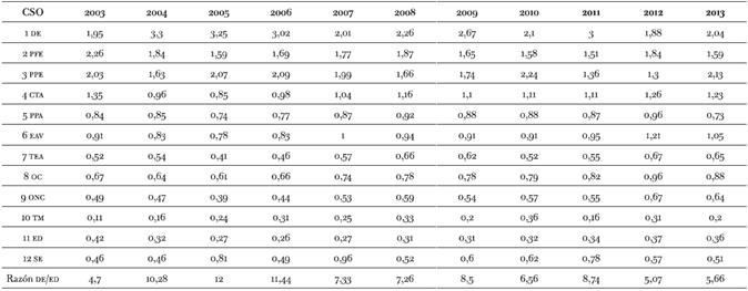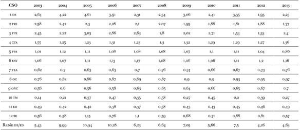 Figura 2: Razones de ingresos entre estratos seleccionados (GBA 2003-2013)