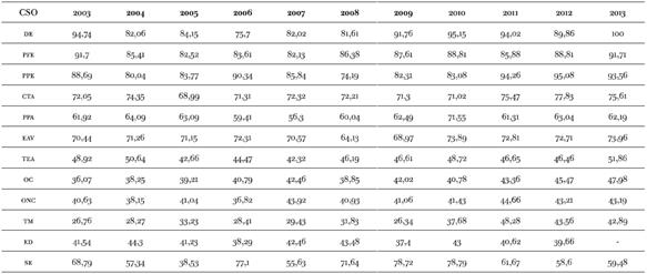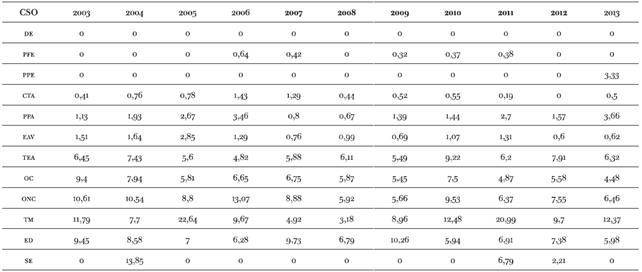 Tabla 7: Porcentaje de subocupación( demandante y no demandante) según estratos sociales por año ( GBA 2003-2013)