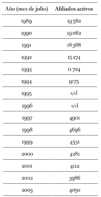 La tendencia declinante comenzó con la racionalización de personal, tuvo la caída más abrupta tras la privatización y se extendió hasta el 2002, pasó de registrar 19 582 afiliados en 1989 a 3986 en el 2001, es decir, un 80 % menos. Esto generó una erosión de la base de sustentación y de la capacidad de movilización del gremio, e impactó en su economía al afectar su fuente principal de financiamiento, la cuota de afiliación.