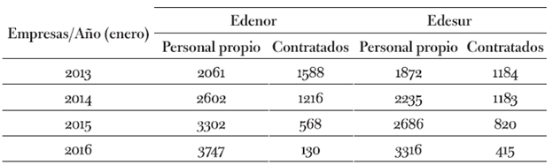 En la tabla 1 se observa que la reducción comenzó antes de la privatización de 1992 y se exacerbó luego de la misma: en casi una década las empresas eléctricas expulsaron al 70 % de su personal efectivo. Este proceso persistió hasta el 2002, año que marca el piso de la tendencia descendente, tal como expresan los datos correspondientes a las dos empresas distribuidoras más importantes, Edesur y Edenor (tabla 2).