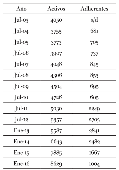 Tabla 6: Afiliados activos y adhérentes al LYF CF (2003-2016)