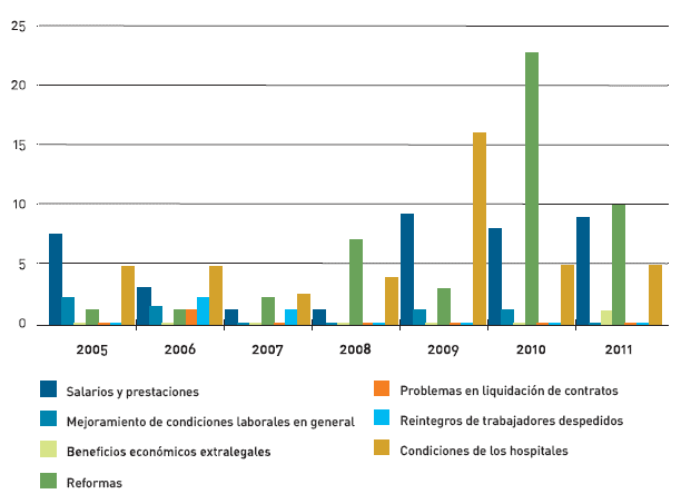 Por otra parte, las relaciones entre acciones contenciosas (protestas sociales) y no contenciosas (constitución de asociaciones y contienda legislativa), así como los ciclos de protesta, estuvieron marcadas por las actuaciones de los gobiernos. En la etapa inicial de la implementación de las reformas un sector del gremio médico fue muy combativo. Como sus protestas sociales fueron efectivas, las reformas disminuyeron. Posteriormente, cuando se produjeron ajustes a la regulación pensional, se hicieron más evidentes los problemas de funcionamiento del SDS, lo que se vio reflejado en el cierre de hospitales y en la intensificación de las protestas de los médicos (con las que consiguieron algunos logros parciales). Aunque las protestas por asuntos laborales siempre estuvieron presentes, a partir del periodo 1998-2002 las motivaciones de aquellas también fueron por las reformas y las condiciones de los hospitales, lo que puede sugerir una mayor politización de la acción colectiva.