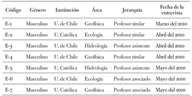 En la esfera científica se seleccionaron académicos de las ciencias naturales de dos universidades: Universidad de Chile y Universidad Católica, ambas localizadas en Santiago, la capital del país, ya que estas instituciones, además de realizar docencia, investigación y extensión1, concentraron el 50 % de todos los tipos de publicaciones nacionales realizadas en Web of Science entre los años 2000 y 2008, y el 70 % en el periodo 2000-2013 (Comisión Presidencial Ciencia para el Desarrollo de Chile, 2015). En la tabla 1 se presentan algunas características de los académicos entrevistados.