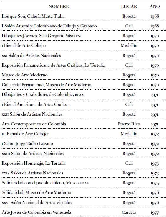 Es de destacar que en este periodo comenzaron a realizarse eventos que sirvieron para consolidar el campo de la plástica, como las Bienales de Arte. En Medellín, por ejemplo, Coltejer organizó la Bienal Internacional de Arte en tres oportunidades (1968, 1970 y 1972), las cuales, como recuerda un historiador, "permitieron a un público amplísimo, tal vez el más numeroso que para estos efectos se haya hecho presente en Colombia, contemplar y comparar las últimas expresiones de arte" (Tirado Mejía, 2014, p. 297). En Cali, el Museo La Tertulia organizó la primera Bienal Panamericana de Artes Gráficas en 1971.