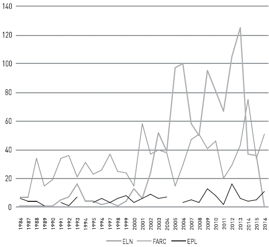Figura 1: Evolución de la actividad armada de las FARC, el ELN y el EPL en el Catatumbo
