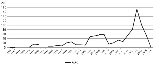 Figura 2: Evolución de acciones armadas de las FARC en el Bajo Putumayo (1986-2016)