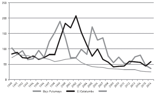 Pese a estos hechos, el registro de los índices de homicidio en años recientes es considerablemente bajo respecto a la evolución histórica de esta variable en el Catatumbo y el Bajo Putumayo, tal y como se evidenció en la figura 3. Desde esta perspectiva es notable la reducción de la violencia letal que afecta la población de estos espacios fronterizos11.