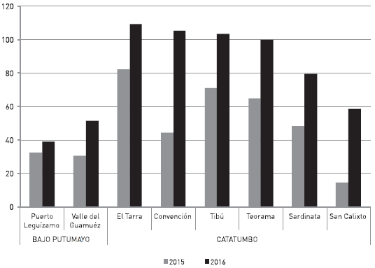 El número de hectáreas de este cultivo ilícito en el Catatumbo y el Bajo Putumayo no ha sido un asunto menor si se dene en cuenta que en el 2015, el 29 % del total nacional estaba concentrado en estas dos subregiones y que para el 2016, Tibú, Puerto Asís, Valle del Guamuez, Sardinata, El Tarra y Orito se encontraban entre los diez municipios más afectados por esta problemática en el país (UNODC, 2016; UNODC, 2017).