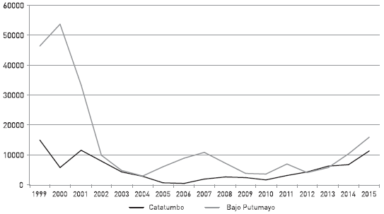 Figura 5: Número de hectáreas de coca en el Catatumbo y el Bajo Putumayo