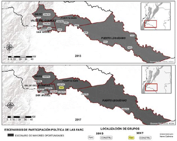 Por su parte, los municipios de Puerto Asís y Puerto Leguízamo también configuran escenarios de oportunidades altas para las FARC, a pesar de algunas variaciones electorales entre los ámbitos rural y urbano. En el primer ámbito, el apoyo de la izquierda fue decisivo para el triunfo de la coalición y la agenda de paz liderada por Santos en la segunda vuelta del 2014. Es más, con resultados ampliamente favorables por el sí en el plebiscito y un número considerable de votos a favor del Polo Democrático, Alianza Verde y el Movimiento Alternativo Indígena y Social (MAIS) en la elección de autoridades locales del 2015, las FARC encontrarían en la zona rural un espacio propicio como movimiento político.