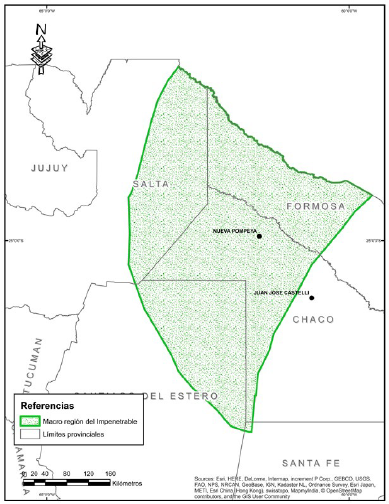 Figura 1: Macroregión histórica del Impenetrable en el Chaco argentino. Se advierte la porción perteneciente a la Provincia del Chaco