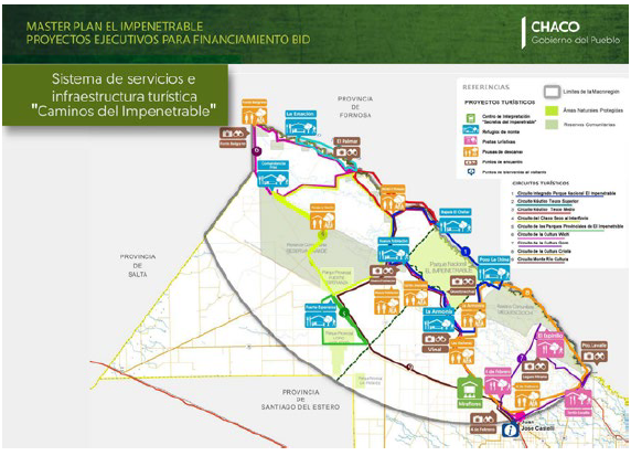 El Sistema Turístico Caminos del Impenetrable permitirá el desarrollo, la promoción y el fomento de la biodiversidad del monte chaqueño, así como las costumbres y el acervo de las comunidades originarias y criollas, expresadas en la gastronomía típica, las artesanías con recursos del lugar, las manifestaciones artísticas representativas de cada una de ellas. El proyecto busca posicionar la zona a nivel nacional e internacional como destino de turismo ecológico e involucrará a los residentes del lugar, beneficiando no solo a los involucrados directamente, sino también a sus localidades y por ende a la región. En su totalidad el sistema aspira a generar cohesión a través de las conectividades físicas y virtuales que articulan o pueden llegar a articular, los diversos flujos de vinculación territorial del Impenetrable. Los proyectos turísticos Ancla se enlazan entre sí y facilitan la diagramación de circuitos y recorridos que permitirán a los visitantes y turistas vivir experiencias en los escenarios naturales y culturales de la región. (MPEI, 2017, p. 56)