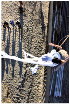 Entendemos por transfronterización performativa aquellas acciones desarrolladas por uno o varios artistas en el límite fronterizo entre México y Estados Unidos, con un afán de desafío de las formas de control, de transgresión, de "ir más allá. La obra To the Rhythm of the Swing (Rocío Boliver, 2012), performance presentada en el festival Low Lives: Occupy! desarrollado entre San Diego y Tijuana, es el ejemplo tomado para nuestros análisis de transfronterización performativa. En la acción, observamos cómo Rocío Boliver inicia su obra caminando acompañada por unos mariachis que cantan un narcocorrido que repite "la vida es un columpio". Tras el recorrido, la artista llega al límite fronterizo donde hay instaladas unas cadenas metálicas sobre una grúa que sostienen un columpio, al que se sube y se balancea, transgrediendo de este modo los límites fronterizos. Durante los quince minutos que dura la performance, Rocío Boliver cruza la frontera incansablemente sin tocar nunca suelo americano hasta que, al final de la performance, se baja los pantalones para mostrar sus posaderas a la migra y, acto seguido, defecar en el lado norteamericano (figura 1). El gesto político que nos interesa radica en el uso del cuerpo como elemento transfronterizo que, más allá de las regulaciones legales, cruza el límite fronterizo por el aire y, por lo tanto, sin dejar rastro, en su balanceo, de su paso por el lado americano. A pesar de ocupar el espacio aéreo americano, no puede ser detenida por la migra porque no ha tocado con su cuerpo el suelo.