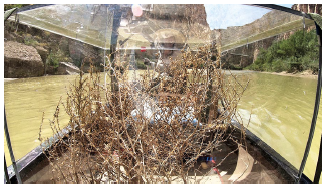 Si la transfronterización performativa implica una acción artística que supone ir más allá de la línea divisoria de la frontera; la sobrefronterización performativa trabaja de manera superpuesta sobre esa misma línea. Para dar cuenta de este nuevo concepto de sobrefronterización, en el contexto del arte de frontera, vamos a analizar la obra Operation Tumbleweed (K. Yoland, 2018), una performance objetual que relata el proceso migratorio de un tumbleweed que ha sido secuestrado, encarcelado en una vitrina de cristal y transportado a lo largo del Río Bravo en la frontera entre México y Estados Unidos (figura 2).