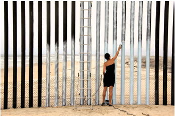 Erasing the Border (Ana Teresa Fernández, 2012) es un ejemplo preclaro de desfronterización performativa a través de la acción pictórica sobre la valla que separa México y Estados Unidos. La obra supone una intervención del muro fronterizo que separa Playas de Tijuana y del parque estatal Border Field de San Diego, usando una pistola de pintura azul (figura 3). La idea de la artista es borrar la frontera para posibilitar su confusión mimética con el azul del cielo y el reflejo del mar. Esto es, invisibilizar la valla con el fin de dibujar un mundo-otro sin límites. Hubo incluso quien pensó que el muro había caído, pues la obra, vista desde lejos genera una discontinuidad entre otros trazados del vallado que parece un espacio abierto. Este trabajo de desfronterización performativa puede abordarse desde tres ángulos: como desfronterización política, antropológica y deconstructiva.