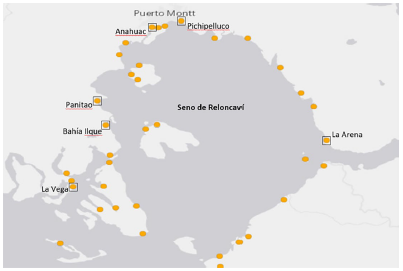 Figura 2: Ubicación caletas pesqueras seno de Reloncaví y unidades de observación investigación
