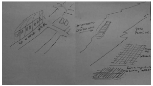 En un nivel más avanzado de registros, algunos entrevistados, ante la invitación a dibujar su barrio y la ciudad, utilizaron el método global que es detallista y refleja una mentalidad cartográfica con mayor sentido de la orientación. En este tipo de representación se suele utilizar diferentes escalas para el marco más general del entorno urbano hasta llegar al barrio, usando detalles de contexto, completando con elementos principales y tratando ser fieles al máximo a la realidad. En la figura 10, la empresa, cuya ubicación y referencia es central para la vida cotidiana, fue el punto inicial para continuar diagramando un entorno.