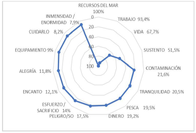 La figura 2 da cuenta de las palabras/expresiones recurrentes que pescadores artesanales, hombres y mujeres, habitantes de comunidades litorales de Los Vilos, Valdivia y Calbuco asociaron al mar, en tanto concepto estímulo. Puede advertirse que la expresión predominante (núcleo de la red semántica) es "recursos del mar" (100 %), al respecto cabe señalar que en esta expresión se agruparon todas aquellas respuestas que aludían a pesquerías específicas (cierto tipo de peces, moluscos o algas). En torno a este núcleo de red, es decir, la expresión con mayor peso semántico, aparece un atributo esencial asociado al estímulo: "trabajo" (93,4 %). En este punto debe indicarse que, de acuerdo con nuestros resultados, para los pescadores artesanales de tres espacios representativos de esta forma de vida en Chile, el mar es básicamente sinónimo de recursos y de trabajo. Como único atributo secundario, la expresión recurrente que las personas encuestadas asociaron al mar fue "vida" (67,7 %), seguido de un único atributo periférico: "sustento" (51,5 %). El resto de los once atributos son todos de tipo personal, es decir, no son socio-antropológicamente representativos.