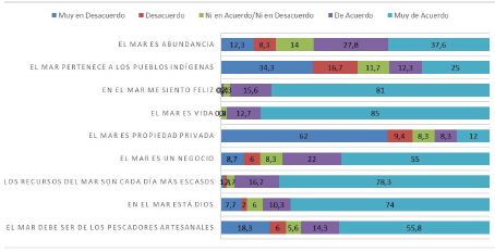 La figura 3 muestra los resultados del cuestionario en formato escala tipo Likert, aplicado en las mismas localidades y a las mismas personas -pescadores artesanales, hombres y mujeres-. En este caso, interesaba cuantificar el grado de acuerdo con respecto a enunciados u oraciones referidas al sentido que los habitantes de estas zonas litorales asignaban al mar en tanto espacio económico (bajo la perspectiva sustantivista y económico-cultural). En primer lugar, cabe referirnos a ideas que aluden a cualidades del mar en sí, pero en tanto cualidades para las personas (pescadores). Por ejemplo, el mar es: "abundancia", "vida", "peligroso", "propiedad privada", "negocio". La afirmación sobre el mar como abundancia nos resulta controversial, pues, por una parte, predomina el acuerdo (65,4 % de acuerdo y muy de acuerdo); sin embargo, se afirma también -y de forma muy marcada- la idea de recursos del mar "cada día más escasos" (16, 7% de acuerdo y 78,3% muy de acuerdo). La controversia podría relativizarse al interpretar que la abundancia alude al mar como lugar genérico y la escasez al mar como lugar de situaciones contingentes. Una segunda afirmación que llama nuestra atención es aquella que declara al mar como "propiedad privada". Aun cuando en Chile las políticas de privatización, ya sea del borde costero, como de los recursos (pesquerías), han sido patentes, se evidencia un marcado desacuerdo (71,4 %). Mucho más llamativa nos resulta, sin embargo, la alusión al mar como un "negocio", donde el 77 % está de acuerdo o muy de acuerdo.