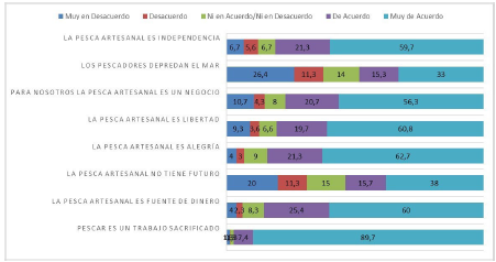 La figura 5 muestra los resultados obtenidos a partir de expresiones sobre la pesca artesanal. Como en el caso de mar, también aquí estas expresiones se construyeron a partir de información narrativa etnográfica obtenida durante investigaciones realizadas entre el 2011 y el 2015. Además, en la figura 5 se observan algunas ideas referidas a lo que podría entenderse como las cualidades inherentes de la pesca artesanal, y que en este caso darían cuenta de valores asociados a esta forma de vida o actividad. Expresiones como la pesca artesanal es "independencia", "libertad", "alegría", "negocio" o "fuente de dinero" dan cuenta de ello. Dichas expresiones se utilizaron para visualizar qué tan instrumental, en el sentido deliberado y economicista, podía ser la pesca artesanal para sus protagonistas, por esta razón se acudió -como contraste- a ideas que, como en el caso anterior, cabría asociar a valores simbólico-culturales en un sentido identitario. Ahora bien, los contrastes no resultaron evidentes o marcados; por ejemplo, advertimos que la idea de pesca artesanal como "negocio" o "fuente de dinero" genera acuerdos significativos (77 % y 85,4 %, respectivamente) entre las personas encuestadas. Al mismo tiempo se le asignan importantes grados de acuerdo a dos expresiones que aluden a valores que, no necesariamente, cabría relacionar con la economía en tanto articulación a los mercados: la pesca artesanal es "libertad" y es "alegría" -y podríamos añadir "independencia"-, donde también obtenemos altos grados de acuerdo (80,5 % y 84 %, respectivamente). Anticipemos un aspecto que retomaremos en la discusión, "libertad" (y también "independencia") tenían para nosotros un sentido valórico no referido al mercado. Nos parece importante subrayarlo.