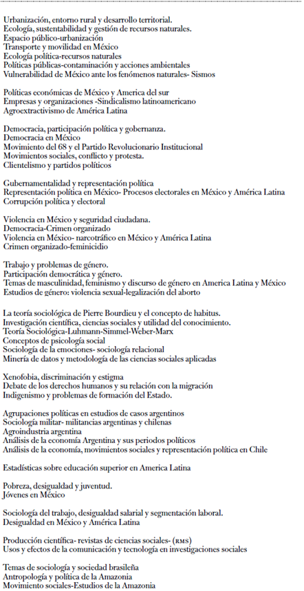 Un recorrido por las temáticas centrales de la RMS (tabla 2) es también una lectura de las agendas de investigación y de los problemas sociales y políticos prioritarios que vertebraron la necesidad de conocimiento en México y en América Latina, y hoy, en la sociedad global de mercado y el conocimiento de sus nuevos contenidos nacionales y regionales que han rehecho la agenda de investigación de las instituciones productoras del conocimiento social y político, desde mediados de la década de 1980 hasta hoy (Pozas, 2019, p. 915).
