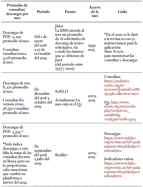 Tabla 3: Estadísticas de consultas y descargas de la Revista Mexicana de Sociología