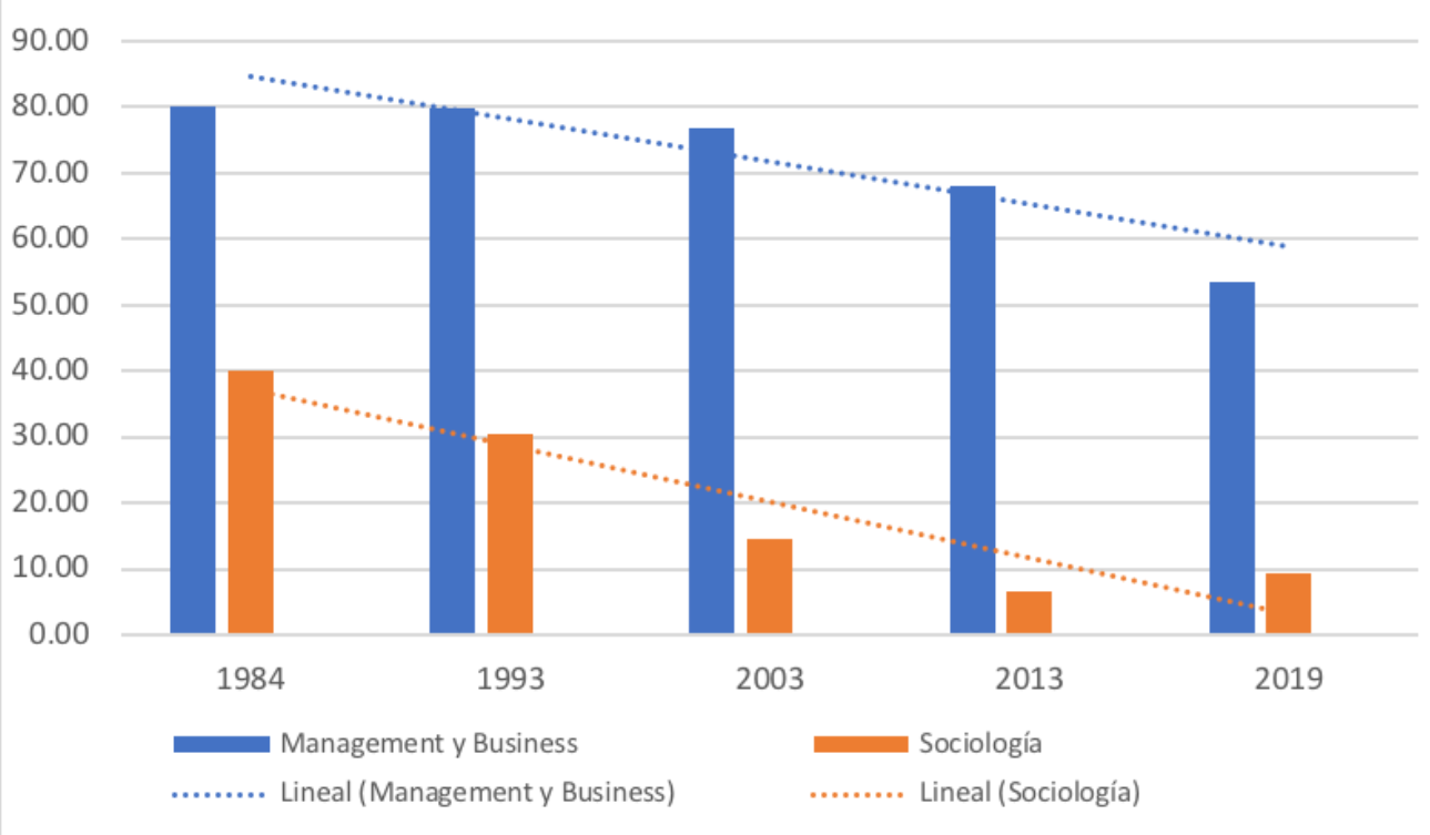 Figura 1: Porcentaje de citas de “The Iron Cage Revisited”, categorías Management/Business y Sociology