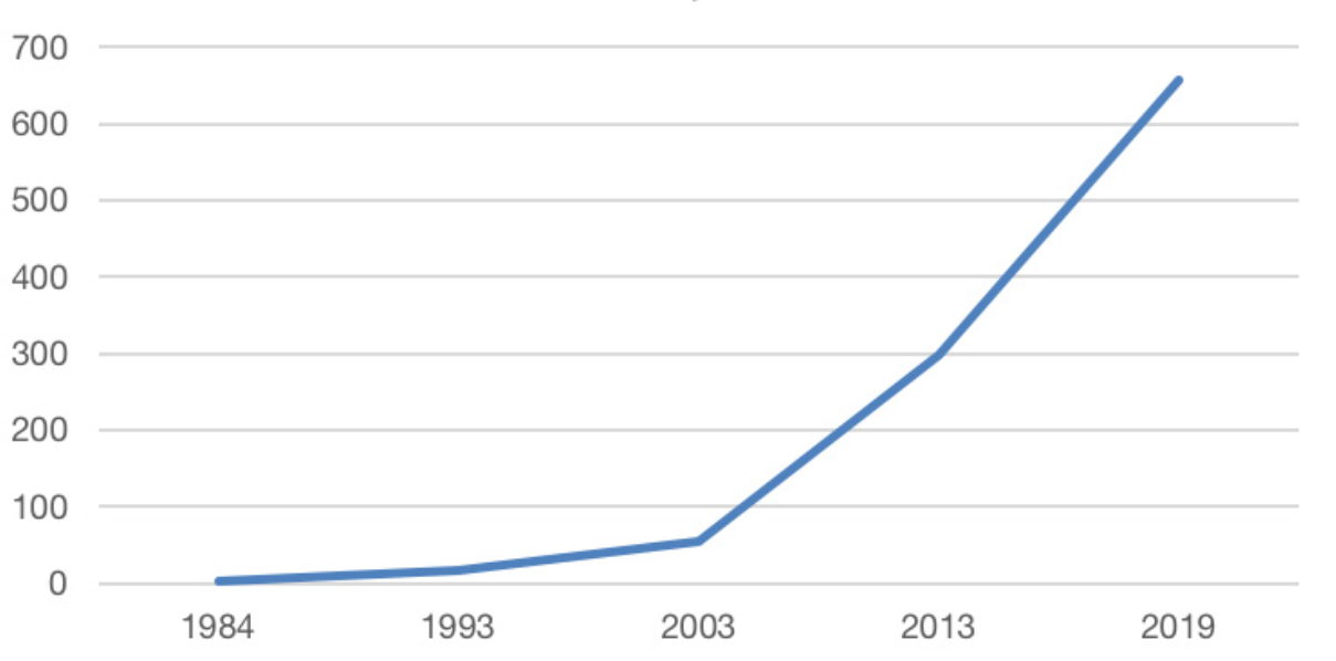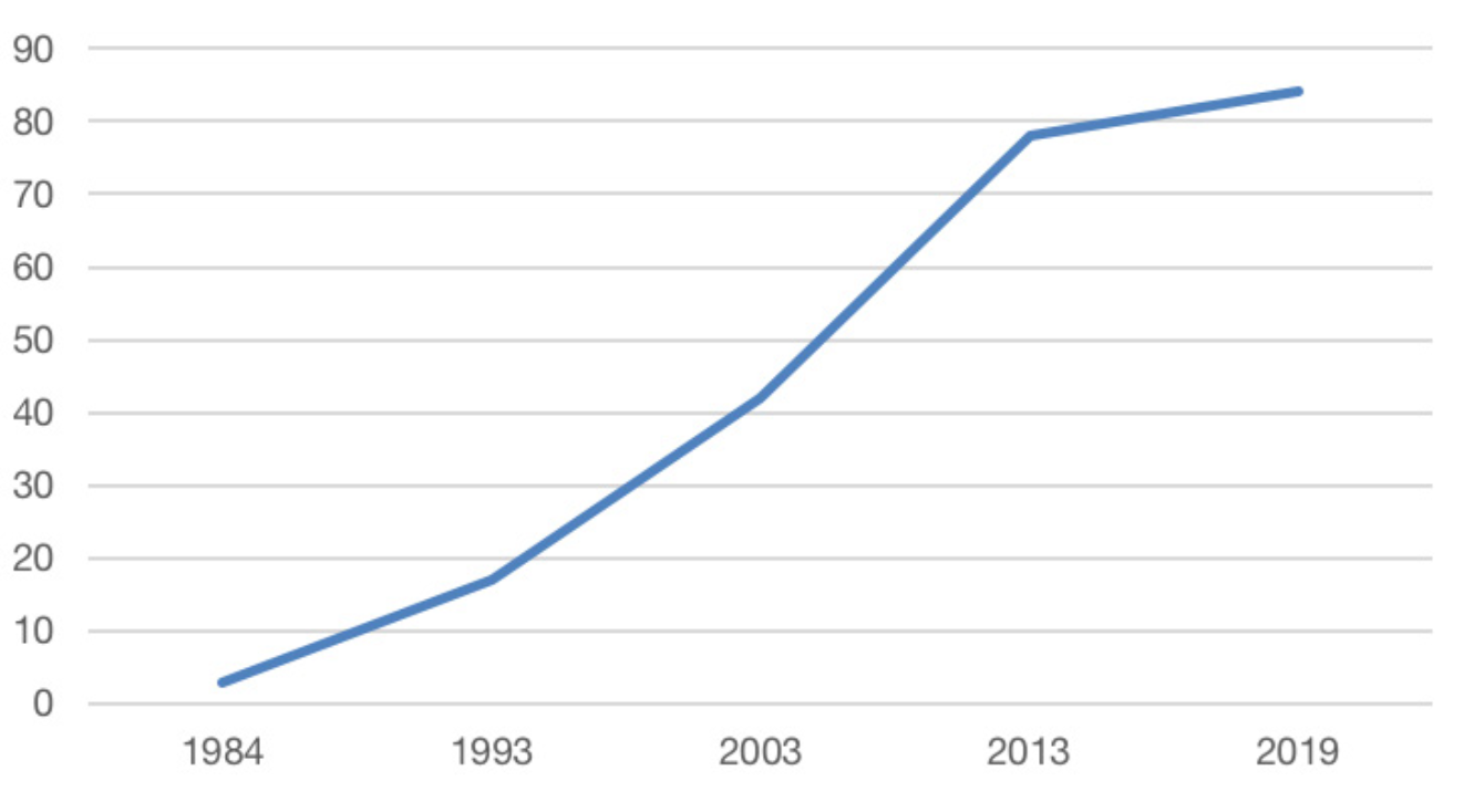 En poco tiempo, el artículo alcanzó una difusión notoria. Greenwood y Meyer, un par de estudiosos del campo del management, comentaron que solo “un pequeño número de documentos tiene un recuento de citas increíblemente alto y una influencia duradera” (2008, p. 258), particularmente en el mundo académico y científico norteamericano2, llegando incluso a tener dos reimpresiones y una traducción al ruso (DiMaggio y Powell, 1991, 2000, 2010). En efecto, la tendencia en las citas se sostiene aún si se reanudan hoy las estadísticas del artículo: de agosto de 2008, cuando Greenwood y Meyer revisaron la Web of Science3, al segundo semestre de 2020 el total de citas se quintuplicaron: de 417 en 2018, contó con 13 487 solo en su colección principal4.